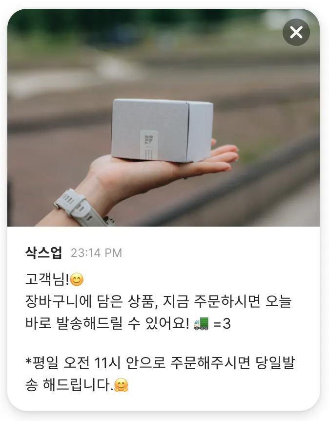 구매가 가장 많이 일어나는 시간대는 평일 오후(14~17), 퇴근(18~20), 주말 점심(12~13), 저녁(18~20) 이므로 해당 시간대에 활동하는 고객들을 대상으로 하기와 같은 구매 전환 유도 알림을 발송한다.